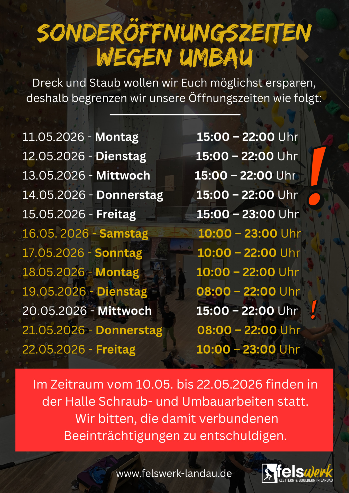 ACHTUNG: vom 10.05-22.05 ist unser Boulderbereich wegen Umbau gesperrt!