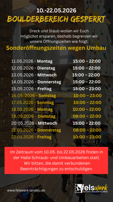 ACHTUNG: vom 10.05-22.05 ist unser Boulderbereich wegen Umbau gesperrt! In dieser Zeit gelten besondere Öffnungszeiten (siehe unten).
