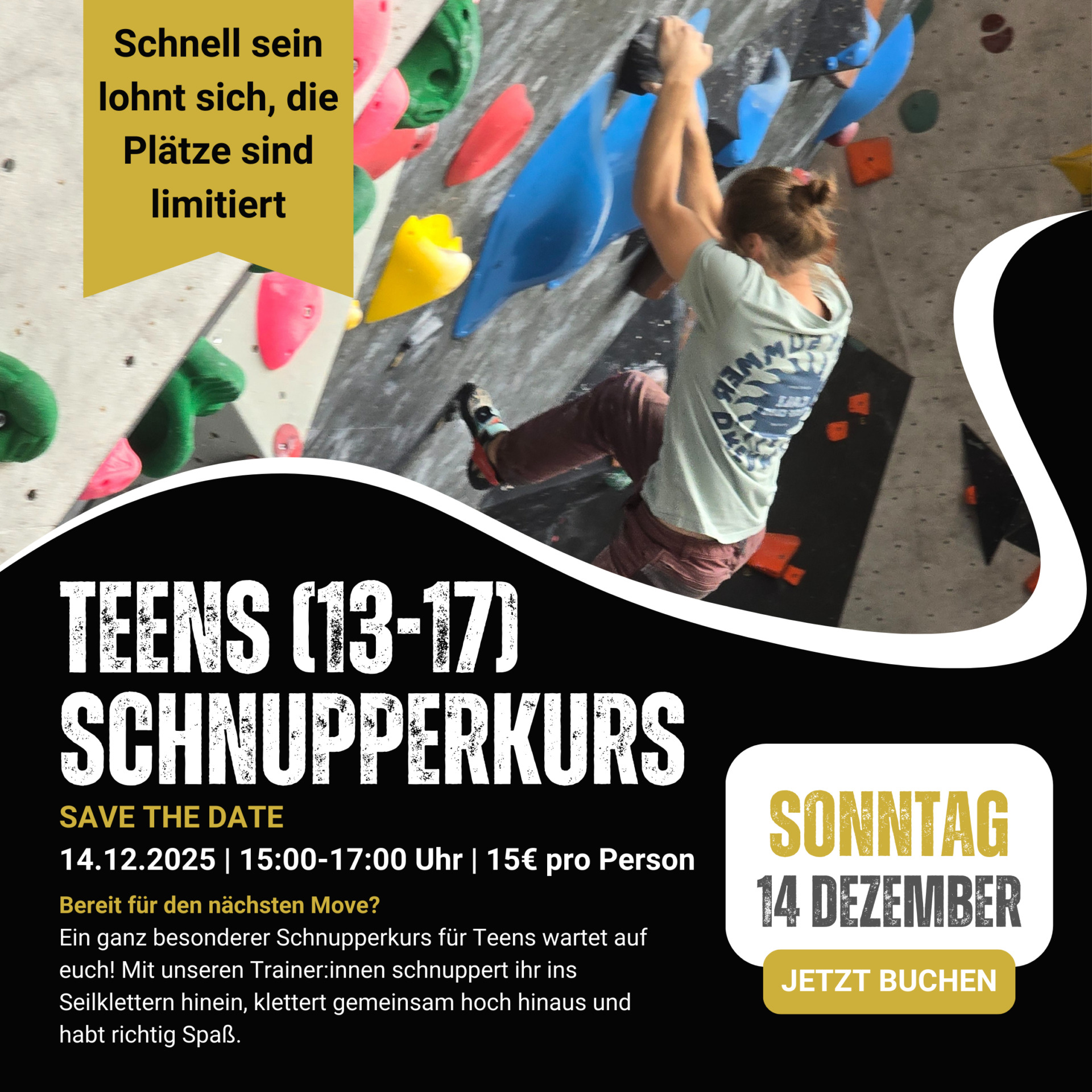 Am Nachmittag bieten wir ein Schnupperklettern für Teens – also Jugendliche von 13 bis 17 Jahren – an. Eine perfekte Gelegenheit, Mut, Kraft und Geschicklichkeit zu entdecken – ganz ohne Vorkenntnisse. Unsere Trainerinnen begleiten alle Schritte und sorgen dafür, dass jeder sich sicher fühlt und Spaß hat – HIER GEHT´S ZUR ANMELDUNG.